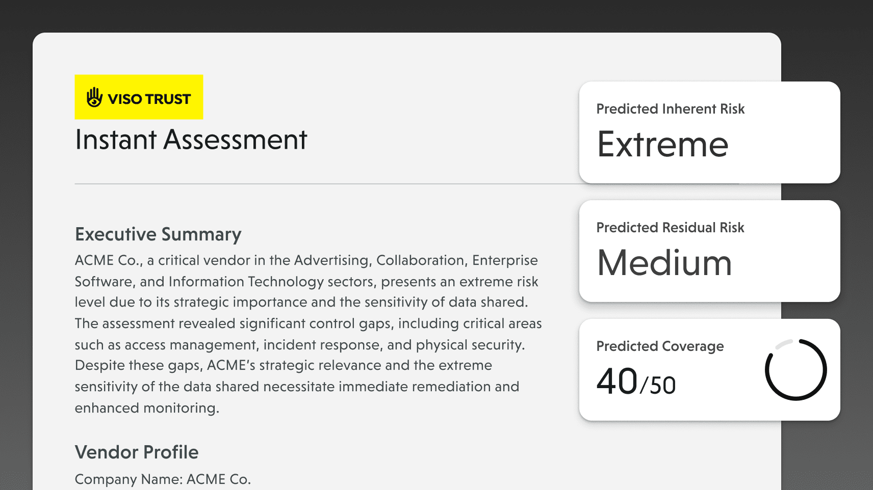 Instead of getting buried in spreadsheets and static reports, you get instant, consistent, and defensible insights that let you manage third-party risk with confidence.